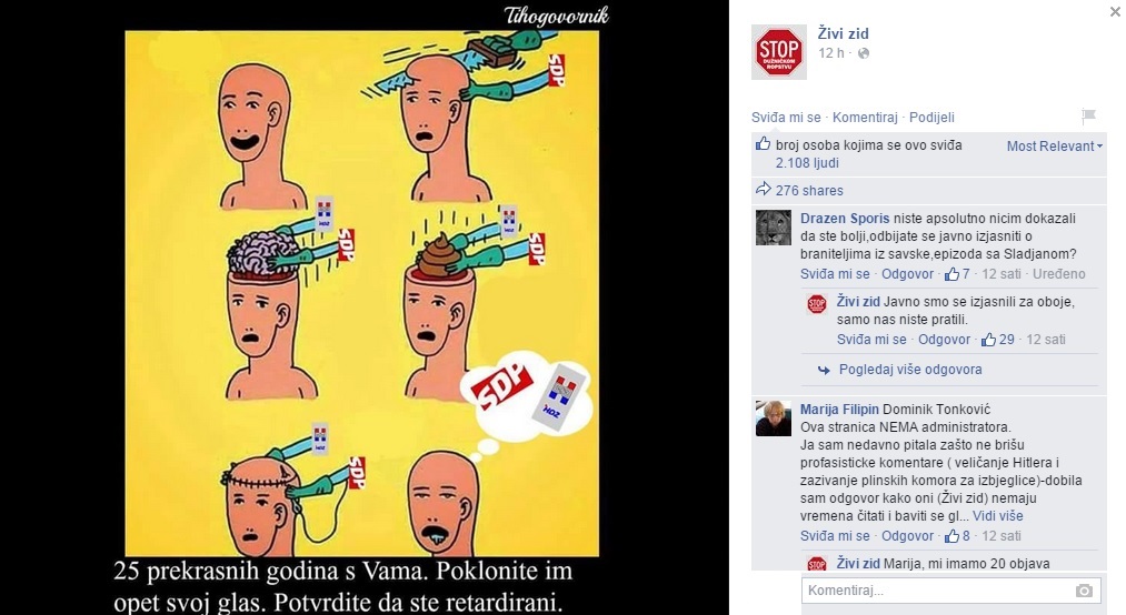 Živi zid sve koji ne glasaju za njih smatraju retardiranima, znači tko glasa za HDZ-u ili SDP-u je retardiran, srećom Živi zid sa cirkusom oko Slađe je pokazao da nije retardiran, bivša čobanica je Pernara samo napravila budalom.