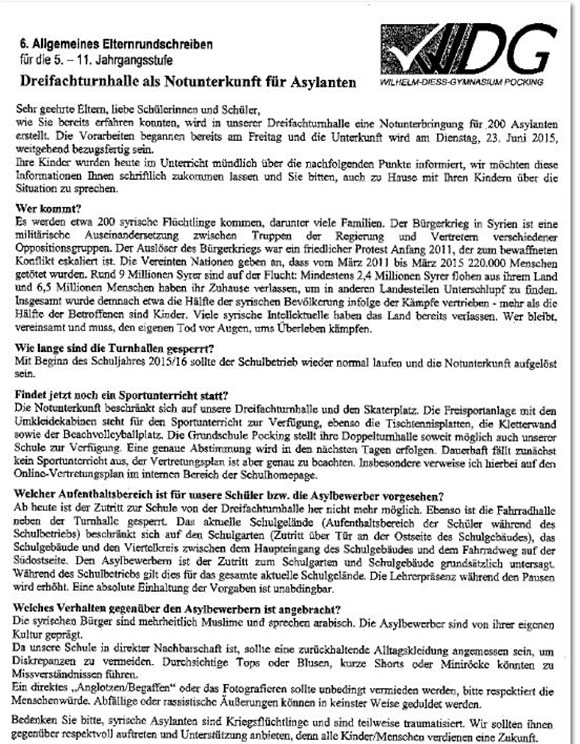 elternbriefZbog velikog broja izbjeglica koje su zadnjih mjeseci iz Sirije i okolnih zemalja pristigle u Njemačku, direktor jedne gimnazije u Bavarskoj bio je prisiljen zamoliti sve učenice da prekriju ruke i noge – za njihovu vlastitu zaštitu od sirijskih izbjeglica preko ljeta smještenih pored same zgrade gimnazije. U svom pismu koje je poslao roditeljima, Martin Thalhammer, direktor Wilhelm-Diess Gimnazije u gradu Pocking koji inače broji 15.000 stanovnika, zamolio je učenice i njihove roditelje da pripaze na odijevanje svoje ženske djece – odnosno da se djevojke suzdržavaju od nošenja odjeće koja „otkriva“ zbog izbjeglica muslimanske vjeroispovijesti. Radi se o oko 200 izbjeglica koje su od 23.lipnja smještene u (za njihov boravak adaptiranoj) gimnastičkoj dvorani u neposrednoj blizini škole. Uz obavezno kratko objašnjenje o uzrocima krvavog sukoba koji je pokrenuo val izbjeglica, direktor preporuča učenicima i njihovim roditeljima smjernice ponašanja kako bi se izbjeglice osjećale što ugodnije u svojoj novoj okolini. Problem je u tome što prilagođavanje treba očekivati s obaju strana, a naročito sa strane „gostiju“ koji također trebaju biti svjesni kulturnih i vjerskih običaja kršćanske zemlje koja ih je primila. Na to direktor ove škole, kao ni ostali Europljani ne mogu imati nikakvog utjecaja, pa se još jednom ponavlja princip u kojem zapadna demokracija podređuje svoj način života onima koji u njoj traže utočište, umjesto obrnute situacije – da se pridošlice prilagođavaju načinu života sredine koja ih je primila. Podsjetimo se samo scena u kojima izbjeglice u Gevgeliji bijesno odbijaju pakete pomoći Crvenog križa, samo zato što na paketima stoji – križ.