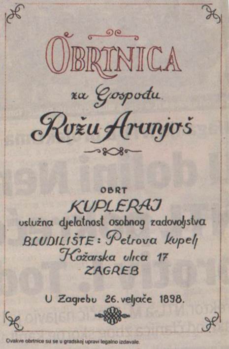 Zagreb je nekada po broju kupleraja bio među prvim gradovima u Europi. Tako je bilo do početka Drugog svjetskog rata. Svaka kuća u Tkalči bila je kupleraj. Za razliku od današnjeg zakona, tadašnja gradska vlast izdavala je obrtnice vlasnicima bordela na temelju kojih su se mogli bavili najstarijim zanatom. Sve je bilo legalno i u duhu vremena. Jedno od poznatih okupljališta bila je i Petrova kupelj u Kožarskoj ulici, koja je bila i prvo mjesto za orgije u gradu. Svodnik, koji bi htjeo otvoriti javnu kuću, morao je prvo ići u Gradsku skupštinu koja je odobravala ili odbijala zahtjeve za otvaranjem “ljubavnih kuća”. Onom kome bi se odobrilo, dobio je za to obrtnicu. Da da, službeni dokument s kojim može legalno imati dame koje bi radile za njega ili nju u ovom poslu. No, da bi mogao imati bordel, morao je plaćati gradu i državi porez za obavljanje posla, sve cure su morale imati lječničku zaštitu tj plaćeno zdravstveno.