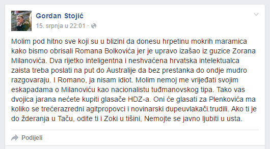 “Molim pod hitno sve koji su u blizini da donesu hrpetinu mokrih maramica kako bismo obrisali Romana Bolkovića jer je upravo izašao iz guzice Zorana Milanovića. Dva rijetko inteligentna i neshvaćena hrvatska intelektualca zaista treba poslati na put do Australije da bez prestanka do ondje mudro razgovaraju. I Romano, ja nisam idiot. Molim nemoj me vrijeđati svojim eskapadama o Milanoviću kao nacionalistu tuđmanovskog tipa. Tako vas dvojica jarana nećete kupiti glasače HDZ-a. Oni će glasati za Plenkovića ma koliko se trećerazredni agitpropovci i novinarski dupeuvlakači.trudili. Ako ti je do žderanja u Taču, odite ti i Zoki u tišini, Nemojte se javno ljubiti u usta” – napisao je Gordan Stojić na svom facebook profilu.