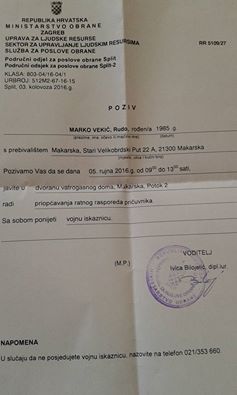 Na  svome profilu Marko V. je objavio dokument, prema kojem na dane izbora njega općina Makarska raspoređuje u ratne postrojbe.