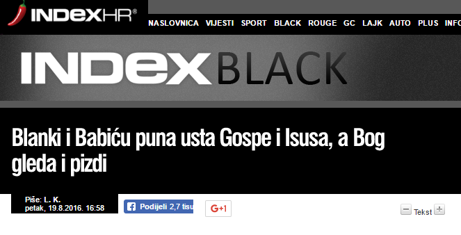 Došli smo na točku s koje nema povratka: Index Matije Babića, onog istog koji hrvatske svece naziva “sušenom govedinom” podučava našu vrhunsku sportašicu Blanku Vlašić kako treba moliti. Jer, kako kaže Index: Bog ih gleda i “pizdi”. Divljački vulgaran i nevjerojatno neprikladan rječnik kojim se Indexovi novinari služe, govori samo o njima samima, ali i o tome koliko se u ime lažne slobode i demokracije potpuno izokreću osnovni standardi i norme civiliziranog društva. O njihovom poštivanju zakona da i ne govorimo. Ne samo da oficirsko “dete” Babić i osuđeni lopov vrijeđa vjerske osjećaje Blanke Vlašić, nego ovim rječnikom vrijeđa hrvatsku sportašicu i po spolnoj osnovi. U ovoj zemlji Matija Babić krade i za ukradene milijune dobiva guljenje krumpira, a u medijima svjesno raspiruje nacionalnu i vjersku mržnju.