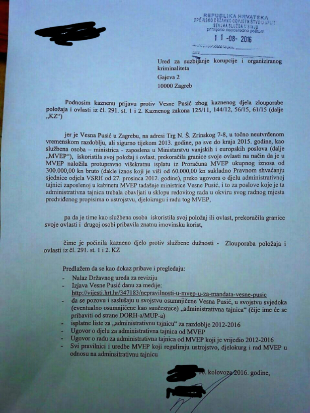 Narodna koalicija bez naroda “dobila je još jednu kaznenu prijavu”, Vesna Pusić se tereti za zlouporabu položaja i ovlasti jer je dopustila isplatu 300 000 kuna iz državne blagajne.