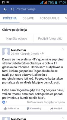 Kulminacija laži dolazi na naplatu jer Pernar ne želi sudjelovati u emisiji Otvoreno sa nekim tko je dobio 11 glasova podrške na izborima u emisiji o živozidašima. Prema tom stupidnom objašnjenju, u Togonalovim emisijama može sudjelovati samo netko tko ima više glasova od Pernara. Znači, svaki gost koji nije bio na izborima, ne smije sudjelovati u emisiji, jer bi se na taj način HRT pokazao nebitnim. Togonal nije pozvao Ingrid Runtić koja je sama, bez ijednog novinara u ovoj zemlji sve lopovluke ovog prevaranta otkrila. Očito jedan vrhunski umjetnik, magistar u struci i svjedok lažnog mesije je preopasan i za HRT, Stankovićevu tvornicu laži i medicinskog brata Pernara, kojeg još jedino neznalice mogu birati u Sabor.