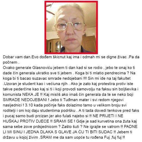Probudila se šumska ekipa. Mirt (stavili joj naočale da pametnije prostakuša izgleda) iz društva Pernar, Sinčić, Palfi, Margetić, Erceg jebe majku onako partizanski generalu Glasnoviću, Andrea Štalcar Furač (nekadašnja ratna izvjestiteljica koja je došla s Radija 101) prijeti generalu toljagom i naziva ga “kamenjarskom kretenčinom”, itd… Hrabra podrumska ekipa iz Domovinskog rata linčovala bi generala jer im otvoreno govori što su. Lukavi general Glasnović na površinu je izvukao sve srbofile i mrzitelje Hrvatske.