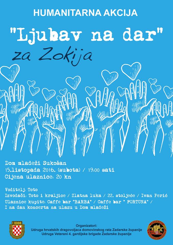 U organizaciji županijskog UHDDR-a i Udruge Veterani 4. gardijske brigade Zadarske županije u subotu, 15. listopada, u Domu mladeži Sukošan održat će humanitarni koncert pod nazivom “Ljubav za dar, za Zokija” namijenjen Zoranu Drobnaku (48) iz Sukošana, koji je nakon nesretnog slučaja, 27. lipnja 2016., prikovan za invalidska kolica. – Zoki je prije tri i pol mjeseca nesretnim slučajem ozbiljno oštetio koštanu srž. Odmah je operiran u Općoj bolnici Zadar te je ubrzo prebačen na daljnju rehabilitaciju u Varaždinske Toplice gdje se još nalazi.