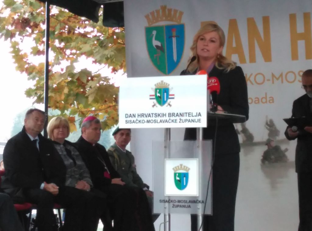 Predsjednica se obratila braniteljima, pripadnicima HV-a, VP-a, specijalne policije i njihovim zapovjednicima te okupljenom mnoštvu toplim riječima, istaknuvši neizmjerne zasluge požrtvovnih dragovoljaca i branitelja bez čije nesebične obrane i velikih žrtava mi danas ne bi imali svoju državu.