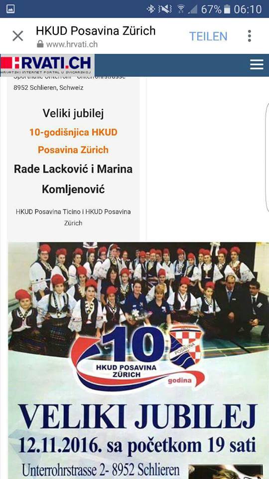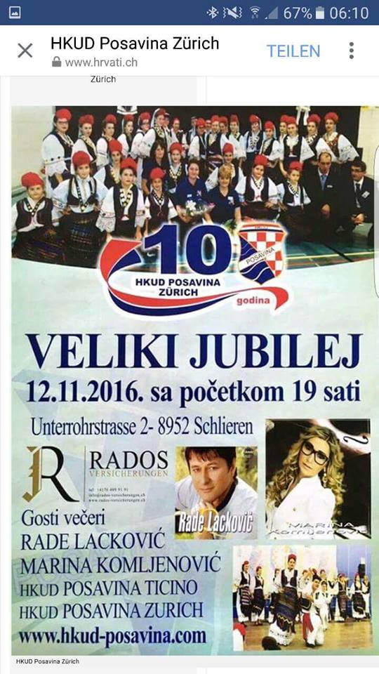 Hkud POSAVINA u Zürichu slavi 10 godina postojanja i na svoju proslavu je pozvala cajkaša Radu Lackovića i Marinu Komljenović. Idealno se uklapaju u ovu proslavu nakon uhićenja 10 Hrvata iz Orašja i optužnice za ratni zločin od srpsko-muslimanske strane. Evo stihova Komljenovićke, kao da ih je pisao sam Ivo Andrić;