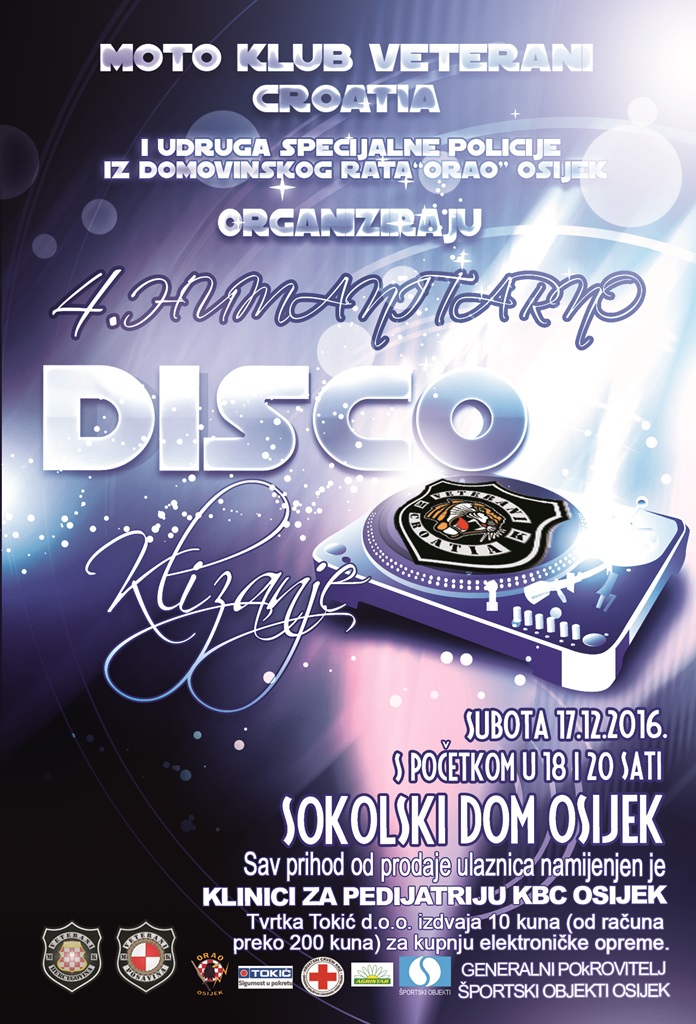 Ovim putem pozivamo sve građane da dođu na klizalište Sokolski dom bez obzira kližu li se ili ne, jer je sav prihod od prodaje ulaznica namijenjen Klinici za Pedijatriju KBC Osijek.  Ulaznica je simboličnih 10kn, dok najam klizaljki ne ulazi u cijenu ulaznice.