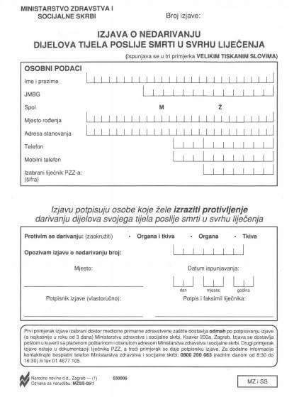 te su mi iz zavoda poštom poslali IZJAVU O NE DONIRANJU DIJELOVA TIJELA POSLIJE SMRTI U SVRHU LIJEČENJA.
