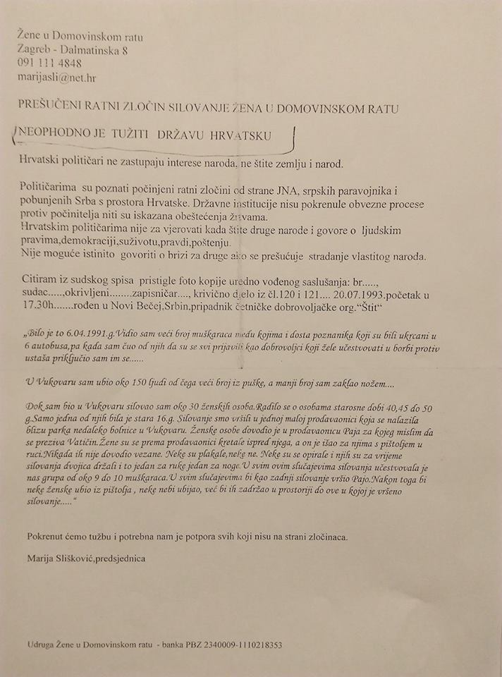 Država je tako odlikovala ženu koja bi tužakala državu, tvrdi da se država ne brine dovoljno o žrtvama rata, iako bi se njoj doniran novac za udrugu mogao znatno bolje iskoristiti. Isto tako država preko Marije Slišković progoni ove dvije gospođe, jer su se usudile prozvati famoznu Mariju Slišković, privatnom tužbom Marije Slišković, umjesto da ispita navode gospođa Biliško i Sarajlija.