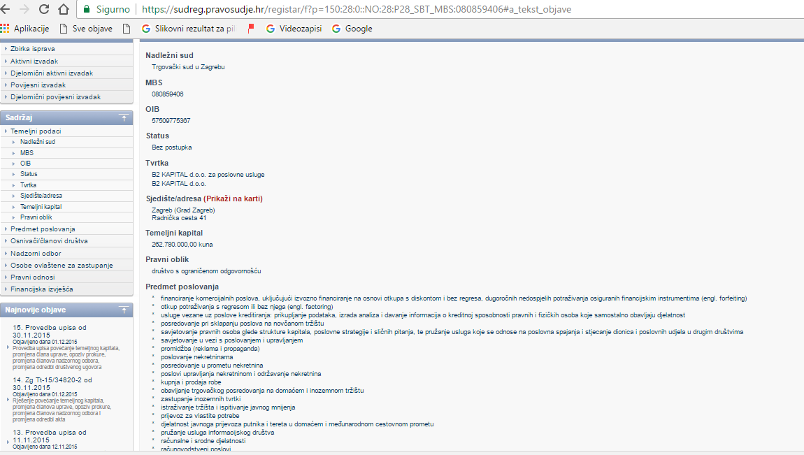 Posljednji događaji koji su zainteresirali širu javnost su aktivnosti trgovačkog društva B2 kapital d.o.o. koje je pri Trgovačkom sudu u Zagrebu registrirano 2013. godine. Kao osnivači toga društva, te 2013. godine u sudskom registru navedeni su B2 HOLDING AS Ltd., Norveška, Bronnoysund, OIB: 27261773783. Direktor društva je bio poznati Ilija Plavčić iz Austrije, Wiener Neudorf koji se navodi kao odgovorna osoba u više europskih financijskih društava. Te 2013. godine B2kapital d.o.o. starta sa 500.000 kn temeljnog kapitala, 27. studenog 2015. godine temeljni kapital povećava se uplatom u novcu sa iznosa od 12.780.000,00 kn na iznos od 250.000.000,00 kn.