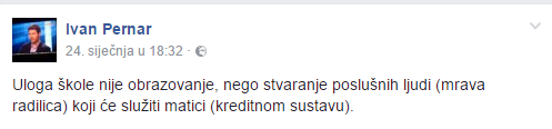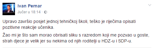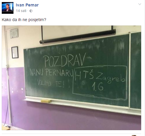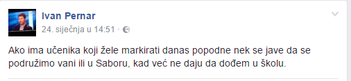 Ravnatelj Elektrotehničke škole iz Zagreba, prof. Renato Matejaš rekao je da je Pernar upao na sat energetike 2h razreda oko 14.15 sati: “Nastavnik se spustio do mene jer nije bilo moguće držati nastavu. Kad sam se popeo do drugog kata Pernar je već bio vani na hodniku. To je sasvim neprimjereno. Mi smo škola, nismo politička pozornica. Postoji neki obrazac ponašanja, da se nam se javi kako bi se takve stvari iskomunicirale. Strukovna smo srednja škola i tu nije mjesto politici.” Međutim, našao se i jedan profesor, i to klasične gmnazije koji, umjesto da štiti učenike, podržava bolesne performanse ovog psihopate iz Sabora. U galeriji slika ispod članka ćete naći i sliku tog profesora koji se zajedno s jednim učenikom naslikava s Pernarom. 24sata je postao turistički vodič za Pernarova sranja. Ujedinjeno napada s Indexom i Rašetom braniteljsku obitelj Culej i daje publicitet ovoj nezakonitoj raboti Ivana Pernara. U zemlji totalnog pravosudnog rasula i pedagoških amoralnosti nismo sigurni ni hoće li se pravobraniteljica za djecu osvrnuti na sve ovo i nešto protiv toga poduzeti.