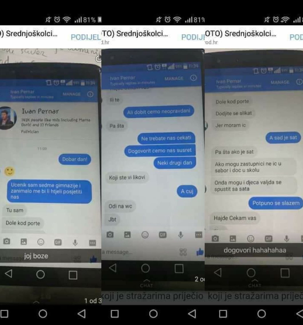 Donosimo prepisku Pernara i nekoliko srednjoškolaca iz koje je jasno da Pernaru ni malo nije stalo do djece i njihovog dobra, već ih koristi isključivo za promociju samoga sebe i koristi se njima kako bi izazvao kaos u društvu.