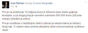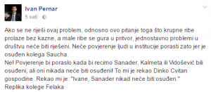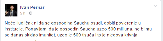 Notorna neznalica i dežurni saborski moralist Pernar niže na svom fb profilu “dokaze” o manjem ili većem lopovluku. Sve zbog Sauche koji je gorljivo stao na njegovu stranu kada se radilo o odluci saborskog povjerenstva u svezi Pernarovog i Sinčićevog izbacivanja iz Sabora, odnosno kada su obojica tražila osudu Reinera. Za Pernara je pola milijuna kuna manji grijeh od 14 milijuna kuna, jer neobrazovani saborski zastupnik nema pojma o Kaznenom zakonu po kojemu je svaka krađa iznad 1.000 kuna kazneno djelo.