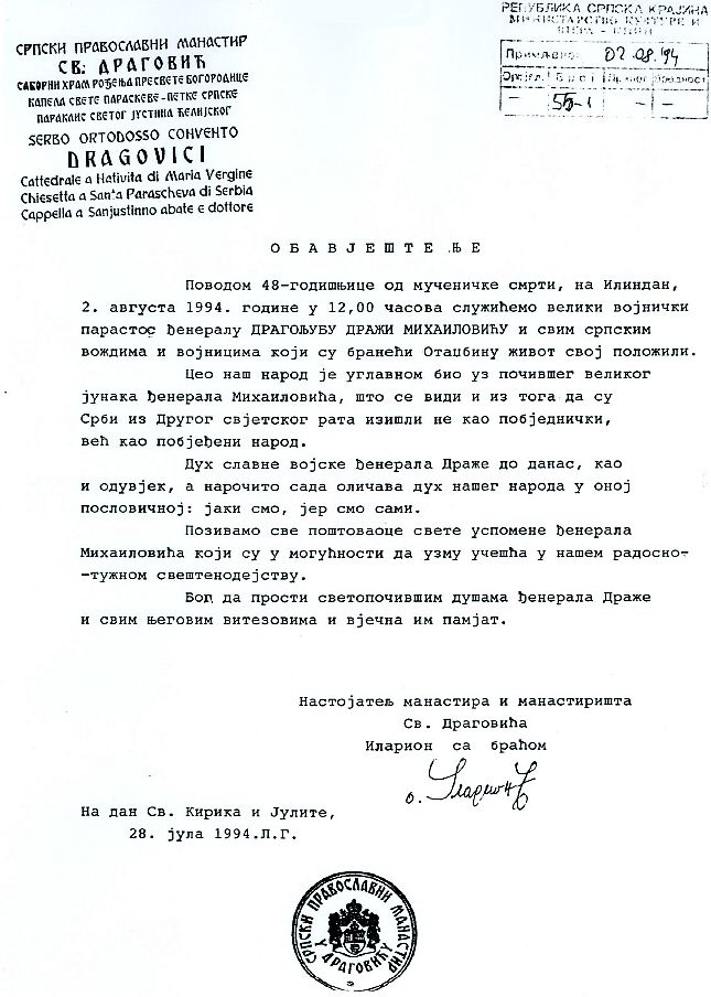 Dajemo na uvid dokument koji potvrđuje veličanje četničkog vojvode Mihailovića koji potpisuje Ilarion i njegova manastirska braća iz manastira Dragovića 1994. godine. Ponajprije prenosimo povijesne činjenice o tri pravoslavna manastira na području Dalmacije, od kojih je jedan i manastir Dragović: