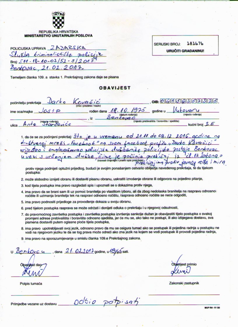 Na vrata stana na adresi Ante Starčevića 2. E u Benkovcu su nam pokucali jedan gospodin policijski službenik u civilu te gospođa policijska službenica isto tako u civilu te su ušli u stan na kojemu boravi moja malenkost i moja osmeročlana obitelj bez dozvole i bez naloga da mogu ući u stan te u prostoriji dnevni boravak počeli vršiti ispitivanje bez prava da imam prisutnog odvjetnika i uz kostantno prekidanje razgovora kad bi govorio o kriminalu što ga čine pojedini policijski službenici ,gospodin kriminalistički inspektor me prekidao sa rijećima ,,slušajte gospodine Darko itd…,, !