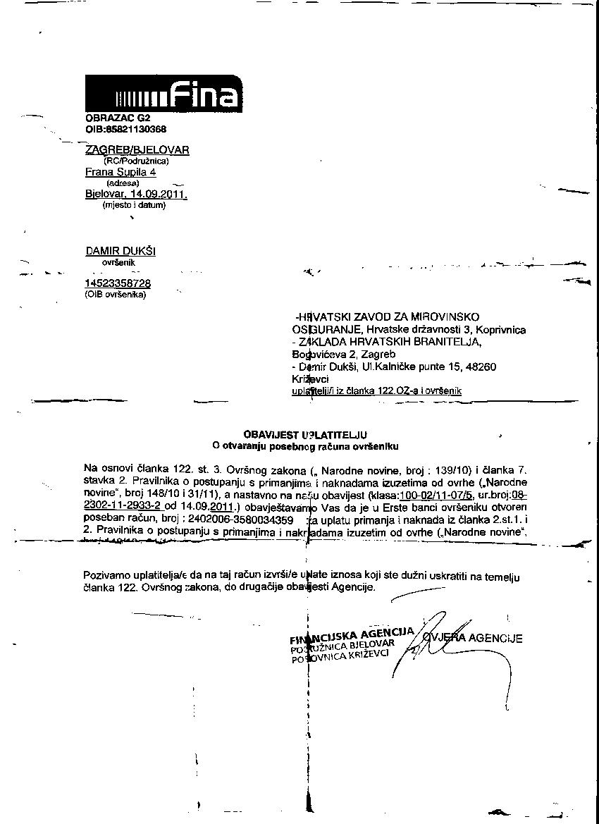Prilažem obavijest od Erste banke od 03.03.2017.god. iz koje je vidljivo kako HZMO- podučni ured u Koprivnici krši ovršni zakon koji se provodi na mojim novčanim sredstvima čl.212.,odnosno čl.172 i 173 zakona.