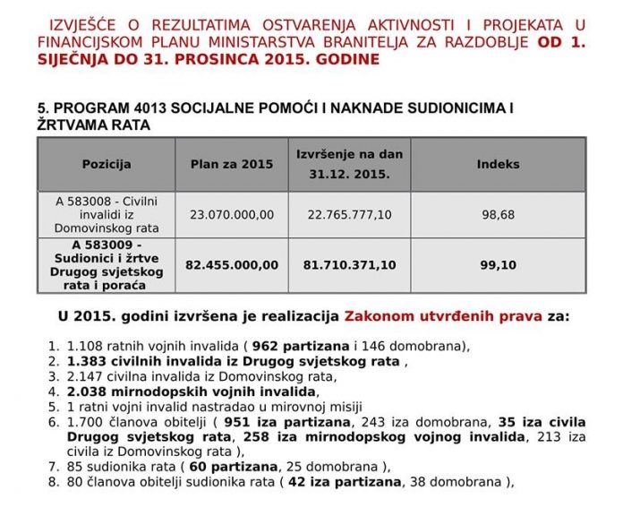 Sjetimo li se izvješča iz 2015 god. dok je MHB vladao Fred Matić i projugoslavenska klika i kada je za Civilne invalide iz Domovinskog rata utrošeno 22.765.777,10 kn a za Sudionike i žrtve Drugog svjetskog rata i porača 81.710.371.10 kn razlike skoro da i nema.