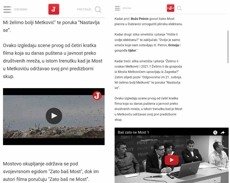 Nismo dugo čekali početak prljave kampanje – u pokušaju da umanji šanse Mosta, nakon što su u javnosti objavljeni rezultati ankete u kojima se jasno vidi kako najveći dio Metkovaca podupire nastavak Mostovih projekata, Hanza medija producira videe i plasira ih “po društvenim mrežama”, čitaj, na svom portalu. Shvaćamo da je namjera bila ocrniti Katarinu Ujdur, no za građane bi bilo korisnije da su taj trud uložili da im na bilo koji način doista i pomognu, pa barem konstruktivnim prijedlogom. Ovakvo prozirno podmetanje neće zavarati Metkovce koji svakoga dana uživo gledaju rezultate gradonačelnice i njenog tima. Mi nećemo sudjelovati u podmetanjima i mutnim predizbornim trgovinama – uzalud ste montirali. Most će i dalje biti za izmjenu Zakona o HRT-u kojim će Hanžekoviću biti uzeti deseci milijuna kuna.