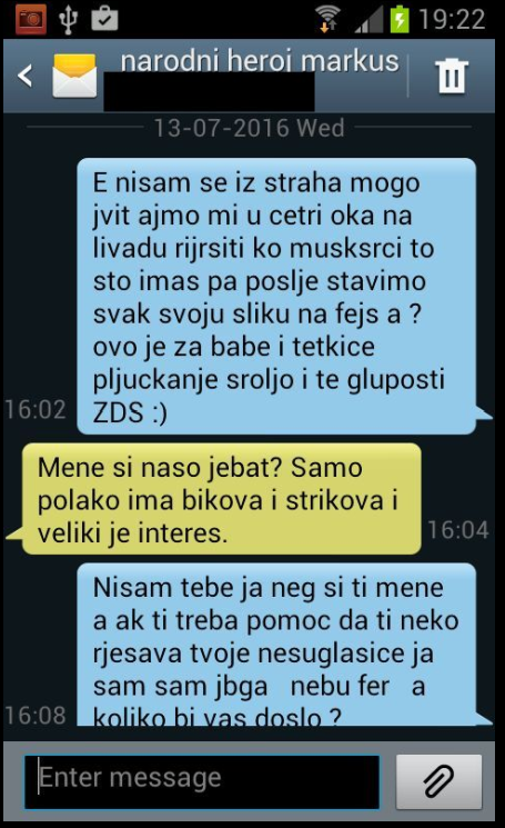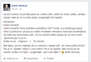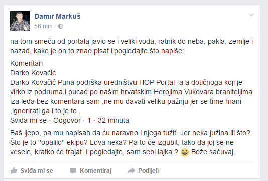 A politička opcija ogrezla u kriminal, naš portal je okrivila za sve. Heroj Markuš je maloljetnog branitelja Vukovara Darka Kovačića nazvao glupanom koji se treba liječiti, našu kolegicu vrijeđao kao zadnji kočijaš, branitelju Dumboviću prijetio štrikom, a lokalnim novinarima prijetio prebijanjem. Samo si držite takvog heroja. Heroj je za vas bio i Ivica Rajić koji je ubio tri visoka časnika HVO-a i tako u crno zavio njihove obitelji.