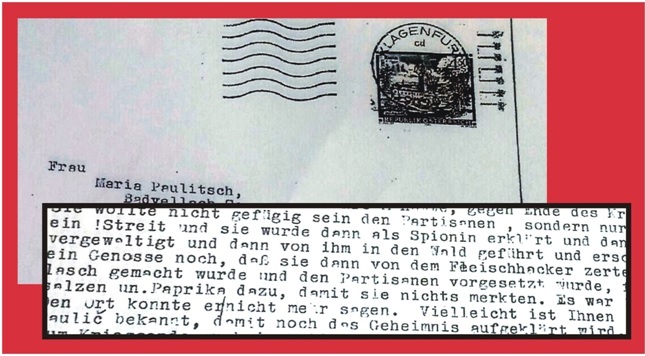 Možda je Vama kao poslovnoj ženi poznata neka Paulitsch, tako da se ova tajna rasvijetli. (…) Možda će te štogod doznati, tko je bila ova ubijena osoba. Toliko na znanje! Počinitelj je bio Slovenac, prepoznao sam to po jeziku. Ja ne želim doći pod udar Papinskoga suda, ali (…). P.K.“