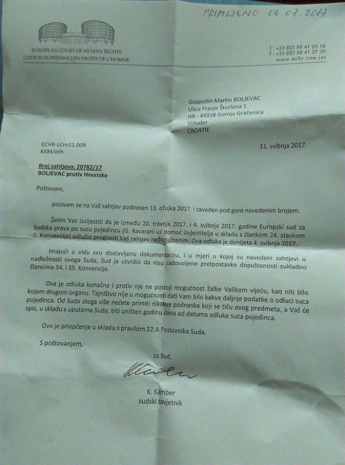 -Odgovor koji smo dobili i način na koji je slučaj objašnjen po meni nije u skladu s reputacijom suda. Podnijeli smo europskom sudu za ljudska prava predmet u kojem se opisuje malverzacija u privatizaciji, što uostalom se reflektira na današnju situaciju. Odgovor je glasio kako je ovo nedopustivi predmet za sud, što znači da nije interes ovoga suda. Bez obrazloženja , odgovoreno jednom suvislom rečenicom.
