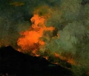 Mato Celestin Medović je prije točno 100 godina naslikao jednu malu, ali nevjerojatno snažnu sliku “Požar”, očito na lokaciji vrlo blizu požara koji danas hara kod Tučepa blizu Makarske. Čim sam vidjela fotografije ovog požara, u meni se stvorila slika M.C.Medovića koju sam vidjela na retrospektivi u Klovićevim dvorima prije nekoliko godina. Ta slika (mala dimenzijama) pokazuje svu razornu snagu požara.