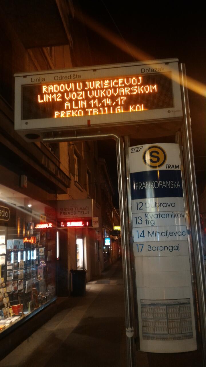 Tijekom ove noći tramvaj broj 11 u pravcu Dubca nije išao iz pravca Ban Jelačić placa od 23.16, iako je najavljivao svoj dolazak u 23.21, pa je dolazk najavljen u 23.33h, da bi i taj dolazak bio otkazan, te je najavljeni tramvaj došao u 23.43 ali je vozio do Dubrave. Kaos na displejima pokazan je i za autobus do Dubca, tako je umjesto najave autobusa linije 34 na displeju stajala obavjest o radovima u Jurišićevoj, pa prevareni putnik tramvaja 11 do Dubca nije imao baš nikakvu obavjest o prijevozu noćnom linijom, a displej je ponudio tu obavjest tek u trenutku dolaska linije 34 na stanicu. Odnosno autobusa.