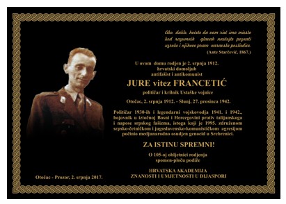 Iz TV vijesti saznajemo kako je tijekom petka (30. lipnja) od stane policije zaustavljen automobil u kojem su se nalazili članovi HAZUD-a (Hrvatske akademije znanosti i umjetnosti u dijaspori) koji su namjeravali obilježiti 105. obljetnicu rođenja Jure Francetića postavljanjem spomen-ploče na njegovu rodnu kuću. Nakon zaustavljanja automobila odvedeni su u policijsku postaju gdje im je oduzeta spomen-ploča.