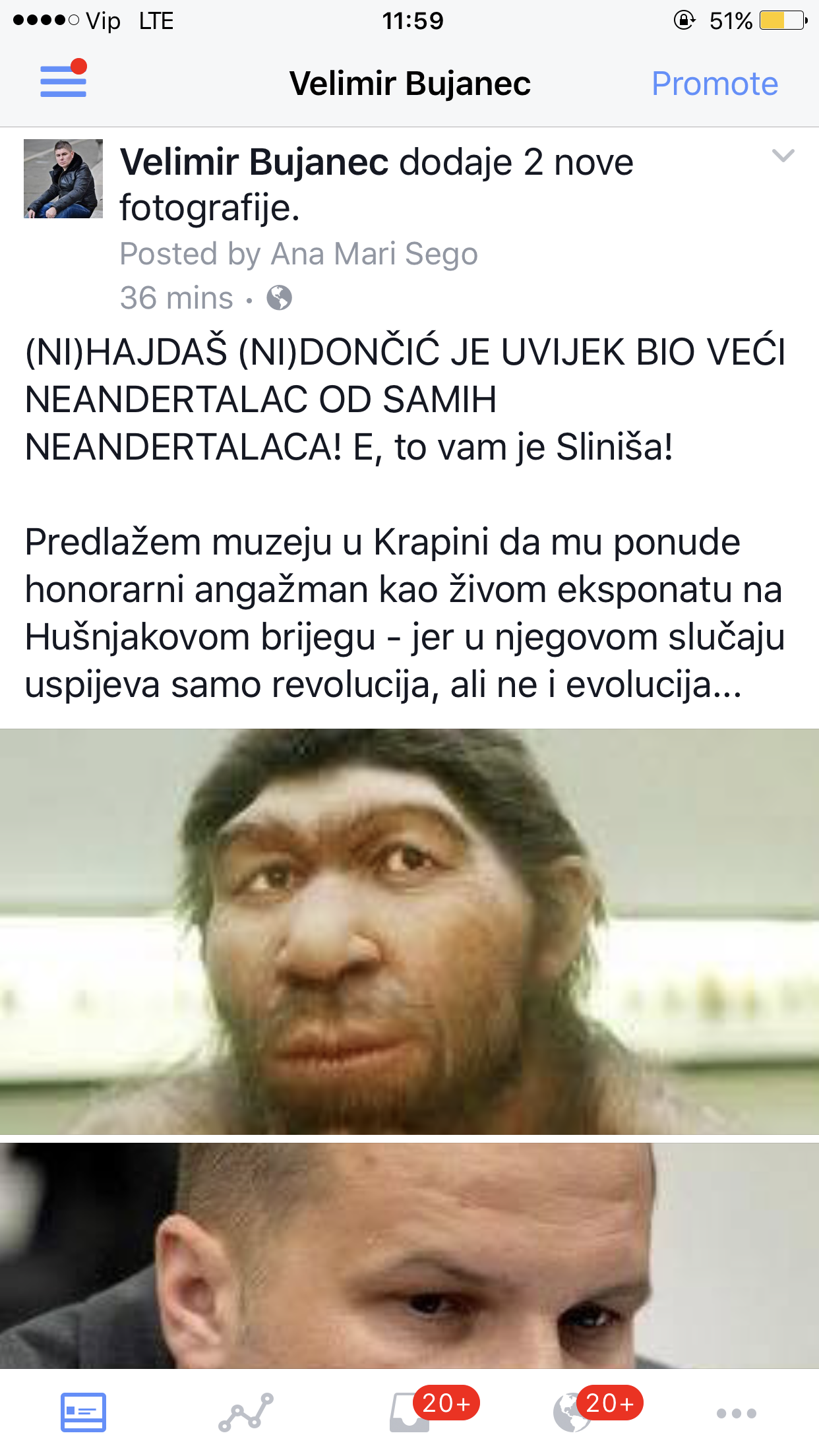 Na svome profilu Velimir Bujanec se narugao drugu priženjenom Hajdašu Dončiću, sdepeovskom opančaru,  koji je kao pravi europejac proglasio Hasnbegovića poturicom. Samo je zaboravio odrediti svoju trasu dolaska u Krapinu. Zagorac Bujanec predlaže njega za trajni postav u Krapini. Inače znastveno je dokazano da neandertalci su bili blage naravi, što sdepepov kadar teško da je ičim pokazao