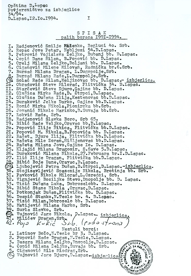 POPIS 48 POGINULIH TERORISTA 1991-1994.GOD. IZ SRBA I D.LAPCA