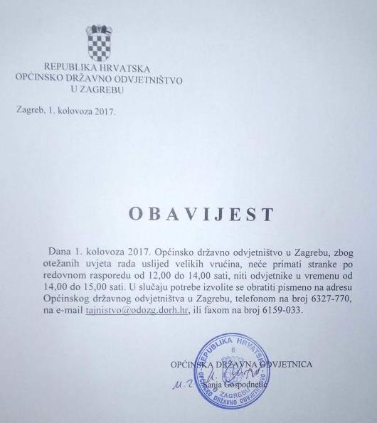 Svi koji su jučer htjeli svratiti u Općinsko državno odvjetništvo u Zagrebu nisu imali sreće. Vruće je i oni su odlučili ne raditi. Zamislite hrvatske branitelje u Oluji da su Tuđmanu rekli: “gle stari žega je, fjaka, ne ide nam se nikuda, čekaj da to malo prođe!”.