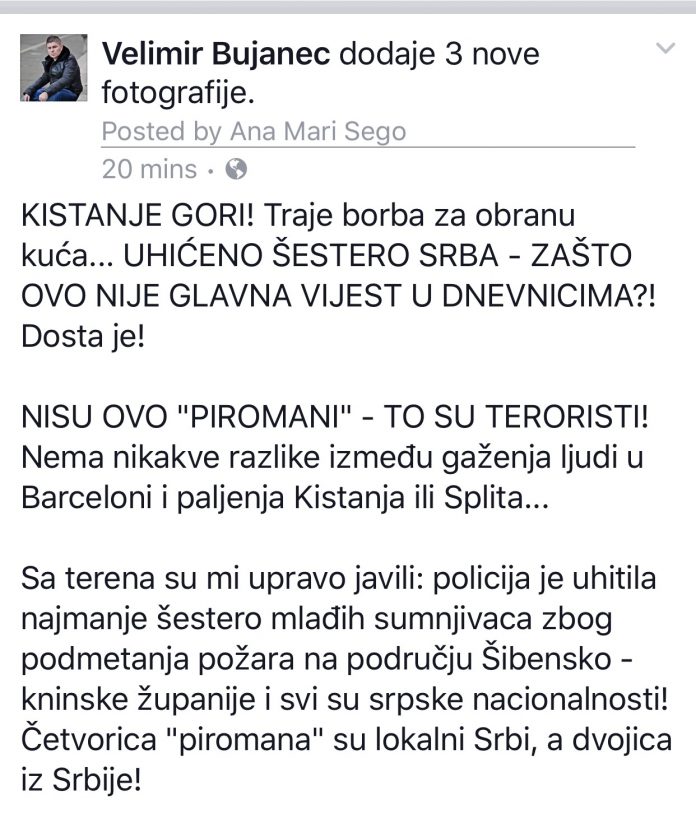 Novinar Velimir Bujanec tvrdi kako su zadnji požari podmetnuti u benkovačkom zaleđu. Šest Srba prema njemu su odgovorni za ovu požarnu katastrofu i ovaj čin terorizma.
