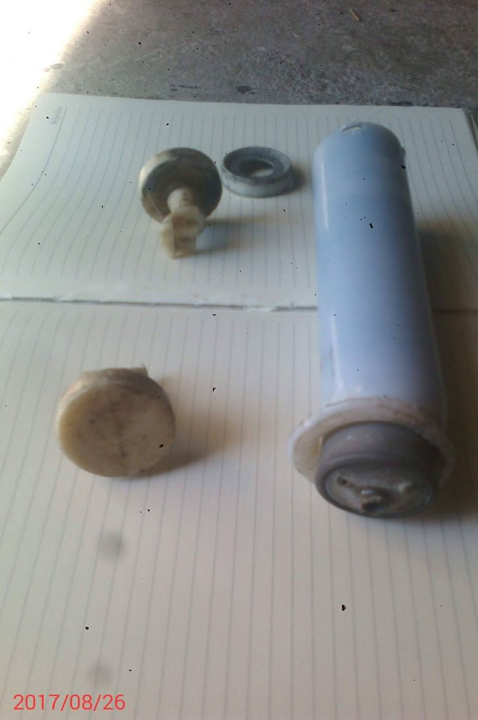 Improvizirana eksplozivna naprava kućne izrade, u cijevi se još vidi barut i brtva, kao i čep koji je, vidi se, pukao plastični na dva dijela ali je imao lufta. A na početnom dijelu plastične cijevi dio gdje je bio fitilj (kad sam je pronašla iz vrha se osjećao miris baruta), naprava je eksplodirala i čep se morao prepoloviti i odletiti u smjeru tj. putanjom gdje je i postavljen. A postavljen ispod desnog rezervoara našeg auta, kome su prije tog iscijedili gorivo iz rezervoara ali ne skroz dno, tako da kad naprava opali auto s rezervoarom praznim a punog pritiska (nema zraka), odleti u zrak! Jer ako ima goriva u autu, ono će vam se samo zapaliti a ovako s pritiskom – leti u zrak!