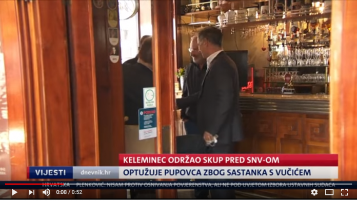 Za vrijeme zadnje konferencije za tisak Dražena Keleminca ispred odaja Milorada Pupovca dogodio se neviđeni skandal koji je snimila NOVA TV, ali nije bilo komentara od “vrhunskih” hrvatskih novinara. Što se naime dogodilo? U kafiću Charlie par metara od konferencije za tisak zamjenik državnog odvjetnika Mladen Bajić i Milorad Pupovac pijuckali su kavice zajedno. To je naravno bilo “slučajno”. Oko osme sekunde na snimci se nalazi ovaj “nezanimljiv” detalj.
