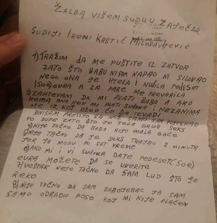 Viši sud u Zaječaru zaprimio je zamolbu osumnjičenog da ga puste iz zatvora jer on nije silovao stariju žensku osobu, već je to učinio za novac i traži sud ili oštećenu novac za napravljenu uslugu…Ne može luđe nego u Srbiji…