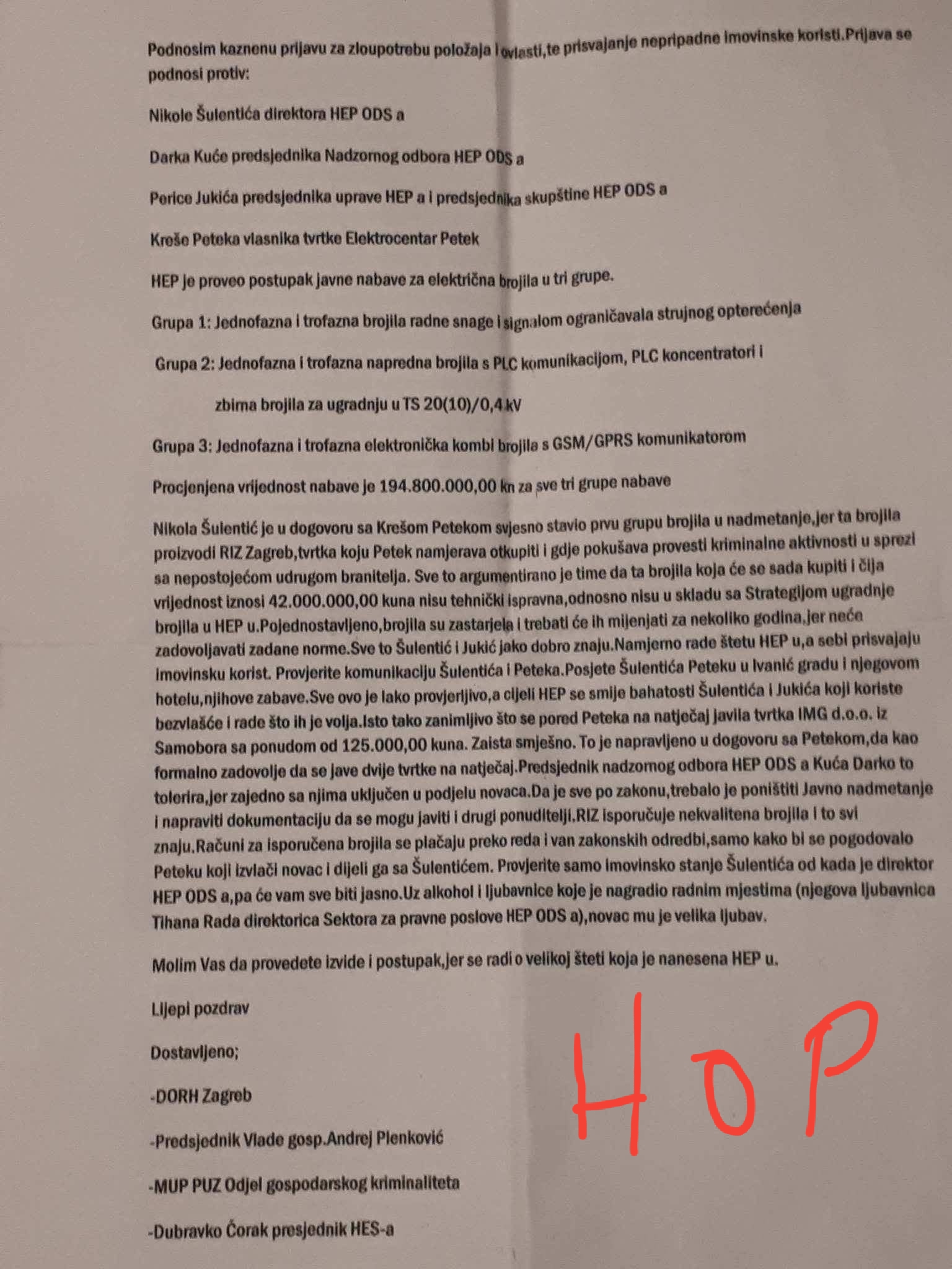Ponuda u javnoj nabavi je vrijedna gotovo 195 milijuna, a kaznenom prijavom se želi ukazati da je namještena isključivo za jednog ponuđača. Ako je javna tajna da pojedinci za tako veliku ponudu vrijednosti dobivaju 4-5% provizije mislimo da pisatelj kaznene prijave aludira kako će u privatne džepove samo u ovom slučaju otići najmanje deset milijuna. Kako je došao do te konstatacije? Prema natječajima izašle su tri vrste ponuda iz HEP-a za taj dio javne nabave. Mi smo u posjedu dva dokumenta za koje su ozbiljno sumnja da su potpisani po povlašetnom položaju, dok treći dokument je povučen zbog činjenice da je jedan ponuđač ponudio znatno nižu cijenu od ostalih, onih priveligirenih, koji su u igri sa upravom, te je zato ponuda stornirana. Umjesto da upravi odgovara najniža cijena, uprava prema ovoj kaznenoj prijavi naštelava poslove osobama od kojih može izvući debelu proviziju. U tome sudjeluju najviše kadrovi iz HNS-a. Zbog te činjenice Plenković nikako ne može posložiti novu upravu, jer su svi željni masnih kolača.