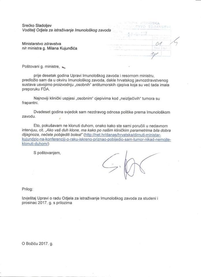 -U skladu s mojom pozicijom u sustavu zdravstva, upozorio sam zdravstvene vlasti na zapanjujuće KLINIČKE rezultate izliječenja uznapredovalih tumora osobnim (individualnim) protutumorskim cjepivima. Naglasio sam i potrebu da se ova neinvazivna metoda uvede kao novi STANDARD u onkoterapiji (1, 2, 3, 4). Na isto sam upozorio i 2009. g. (5, 6, 7, 8). Tvrdim da Imunološki zavod za dobrobit svojih građana može i mora usvojiti proizvodnju osobnih protutumorskih cjepiva!