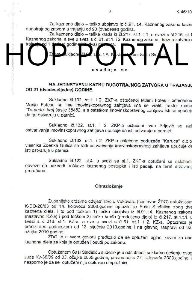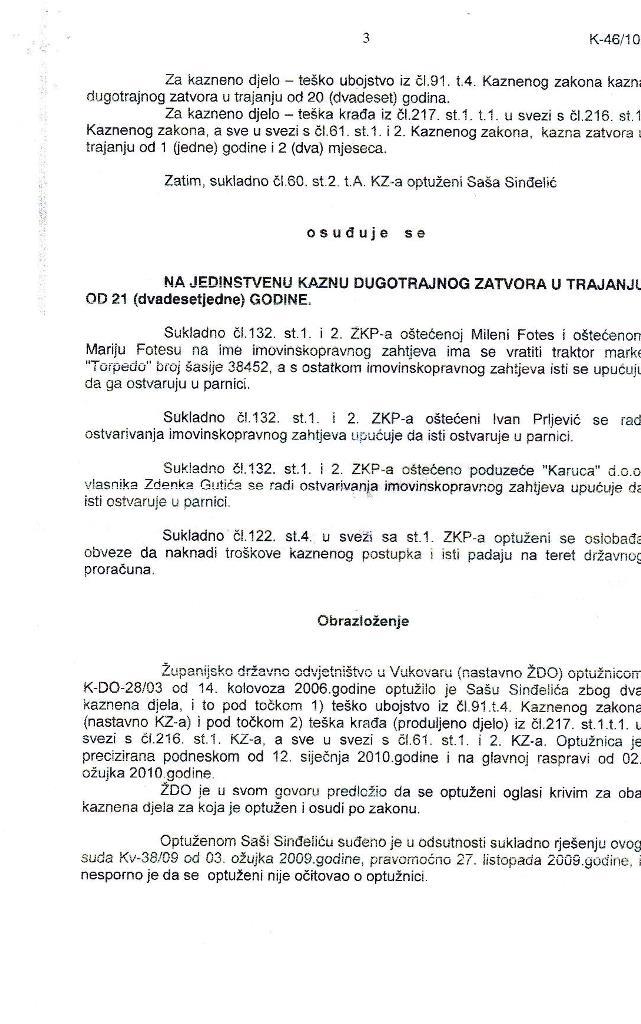 Sinđelić je kao vojnik JNA prešao granicu Hrvatske i Srbije, ubio hrvatskog građanina i oteo mu pokretnu imovinu! Isto tako treba reći da je tužilac Katanić blizak rođak vojvode Velimirovića i na taj način iskoristio je svoj položaj da ovu istragu odvede u krivom smijeru, iako je Velimirović potpisao svojom rukom izjavu (koju mi imamo u posjedu) da je on podmetnuo ključeve od kuće generalu srpske žandarmerije Dikiću, tako ga napravio krivcem, kako bi se domogao veće količine novaca za ovu akciju, dobijene od ruskih obvještajaca. Specijalna policija Crne Gore preko svog čovjeka Dragana Radonjića podmetnula je oružje, za koje danas odgovara general Dikić, a u svemu im je pomogao četnički ravnogorski pokret preko Velimirovića i Sinđelića.
