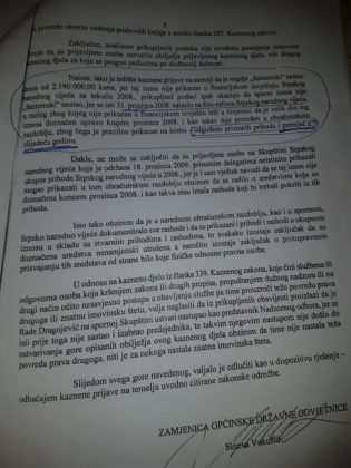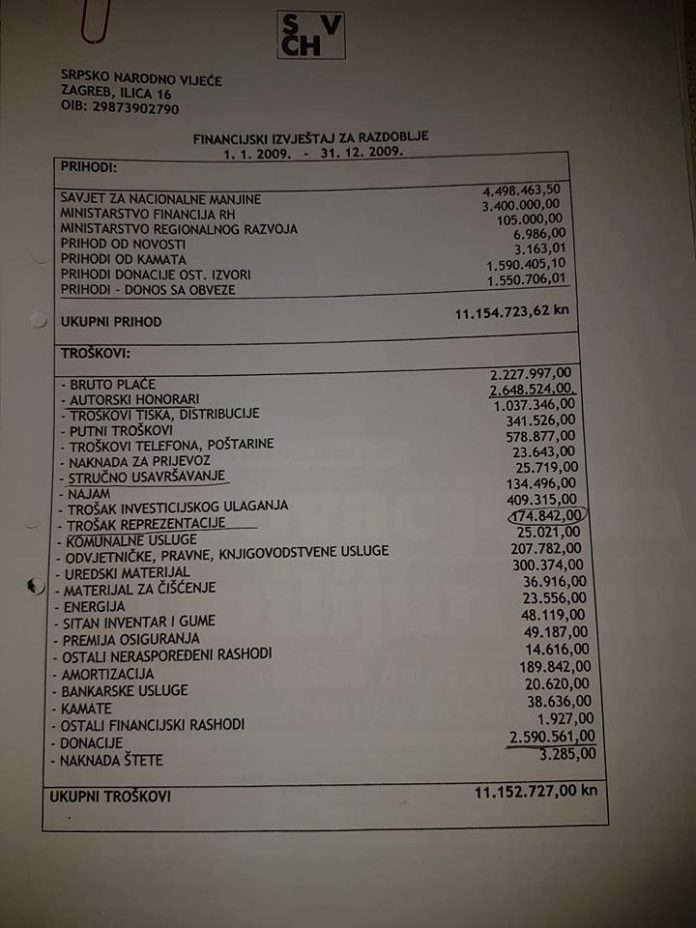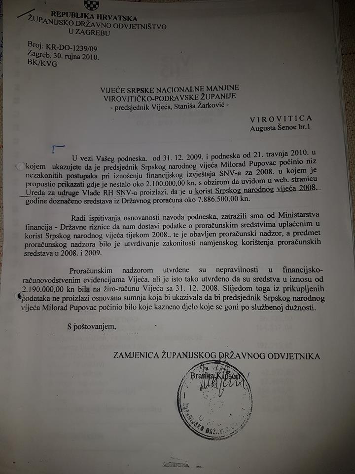 Citiramo pismo:“ U vezi vašeg podneska 31.12.2009. i podneska od 21.travnja 2010. U kojemu kazujete da je predsjednik Srpskog narodnog vijeća Milorad Pupovac počinio niz neakonitih postupaka pri iznošenju financijskog izvještaja SNV-a za 2018.godinu u kojem je propustio prikazati gdje je nestalo oko 2.100.000,oo kuna s obzirom da uvidom u web. Stranicu Ureda za udruge Vlade RH SNV-a proizlazi da je u korist Srpskog narodnog vijeća 2008.godine doznačeno sredstava iz državnog proračuna oko 7.886.500,oo kuna .
