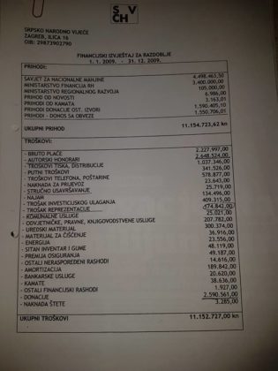 U cit. Rješenju piše , cit.: „ Iz nalaza i mišljenja vještaka proizlazi da je Srpskom narodnom vijeću u 2008.godini doznačeno proračunskih sredstava 7.759.000,oo kuna od čega je u poslovnim knjigama i bilanci iskazano kao ostvareni prihod te godine iznos od 5.569.000,00 kuna te je kao odgođeno priznavanje prihoda za navedeno razdoblje prikazan iznos 2.190.00,oo kuna, dakle navedeni iznos nije prikazan kao prihod“.