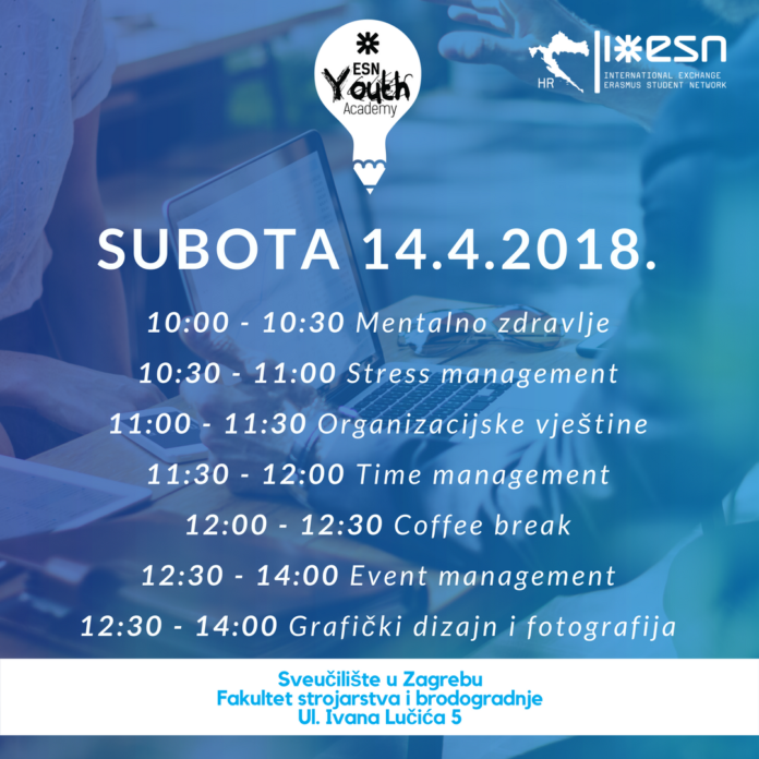 Akademija je osmišljena kao set interaktivnih radionica i predavanja baziranih na temeljnom načelu ESN-a, studenti pomažu studentima.Broj mjesta je ograničen, stoga se obavezno prijavi putem poveznice.  Za detaljnije informacije pratite našu Facebook stranicu i objave u službenom Facebook eventu! Raspored možete pronaći na sljedećem linku kao i na našem vizualu!