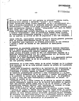Drugi dan je pobjeglo još dvije tisuće srpske naoružane žgadije. Dok je ta srpska gamad i ološ bježala, njihov gazda milicajac i lokalni kninski pijanac Martić odlučio je “hrabro” napasti civile po Zagrebu “Orkanima”, a kako vidimo iz ovoga dokumenta imala je ta gamad i svoje ljude po Zagrebu koji su javljali gdje su pale rakete. Gađani su bili i Banski dvori. Tako to rade hrabre srbende, ubijaju civile jer za borbu nisu nikad spremni! Zato im i smeta pozdrav ZDS. Njihov dom je tamo gdje ima rakije brlje i nešto za silovanje.