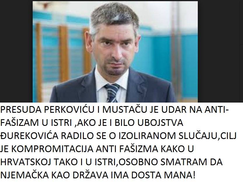 DOŽIVOTNA ROBIJA UDBAŠKIM KOLJAČIMA Perkoviću i Mustaču za IDS i njihova šefa Miletića predstavlja udar na Antifašizam kako u Hrvatskoj tako i u Istri. Nije mu se svidjela neka druga slika antifašizma od one oficijelne u našim glasilima srpsko-komunističke žgadije.