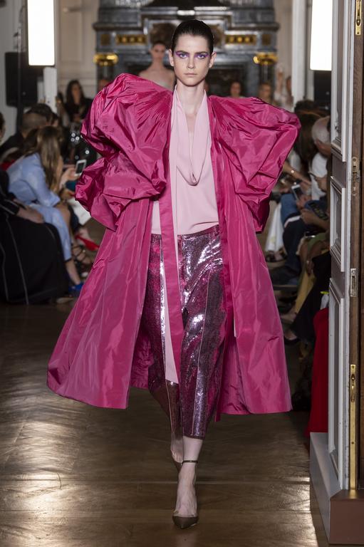 Ispred raskošnog zdanja Doma Invalida, u blizini groba Napoleona Bonaparte, pod staklenom strukturom-ležerne pojave, odjevene u modele Pierpaola Piccoli sastavljene od kaputića, preklopljenih hlača, kapuljača, oprava karakterističnih za visoku modu, ostavile su prisutne bez daha. Žena labela Valentino raste na visokim potpeticama, obavijena raskošnim pliseom ili znalački proučenim drapiranim haljinama. Metalno perje uljepšava joj vrat, upućujući je na uspravno držanje, dok evoluira u varijacijama istaknutih monokromnih boja. Čuvena, crvena nijansa branda spaja se sa plavim ili zelenim preljevima, osvjetljavajući crno-bijele kompozicije odjeće.