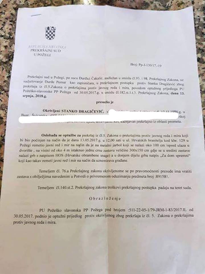 Požeška policija je izgubila sud sa građaninom u slučaju kad je potpuno nezakonito upala u privatni posjed, oduzela hrvatsku u hosovu zastavu i prijavila vlasnika prekršajno. Vlasnik je dobio sudski postupak, na koji se policija nije žalila.