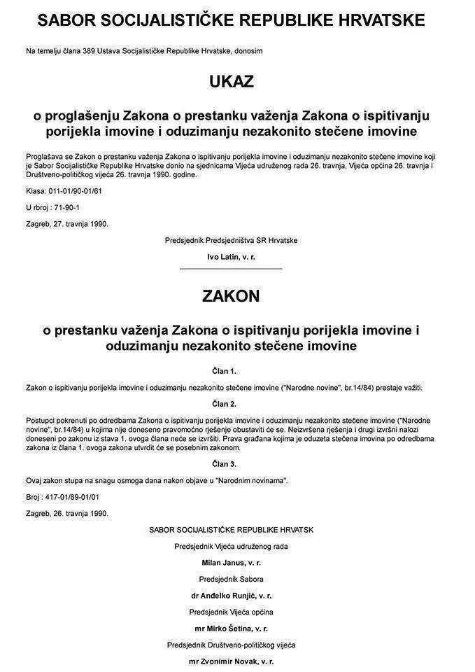 Hdz je 1990.g. donio ZAKON o prestanku važenja Zakona o ispitivanju porijekla imovine i oduzimanju nezakonito stečene imovine. (NN Br. 417-01/89-01/01), čime je širom otvorio put feudalizaciji i kriminalizaciji Hrvatske. Tzv. tranziciji i presvlačenju iz komunističkog u neoliberalni sustav. Stvaranje odabranih na račun opljačkanih.