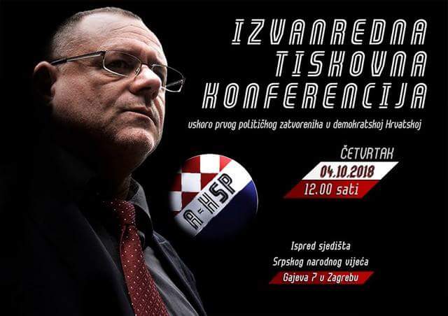 Pozivam Vas na izvanrednu tiskovnu konferenciji USKORO PRVOG POLITIČKOG ZATVORENIKA U DEMOKRATSKOJ HRVATSKOJ , dana 04. listopada 2018. ( četvrtak ) ispred sjedišta SNV i Milorada Pupavca , Gajeva 7 u Zagrebu s početkom od 12, 00 sati.