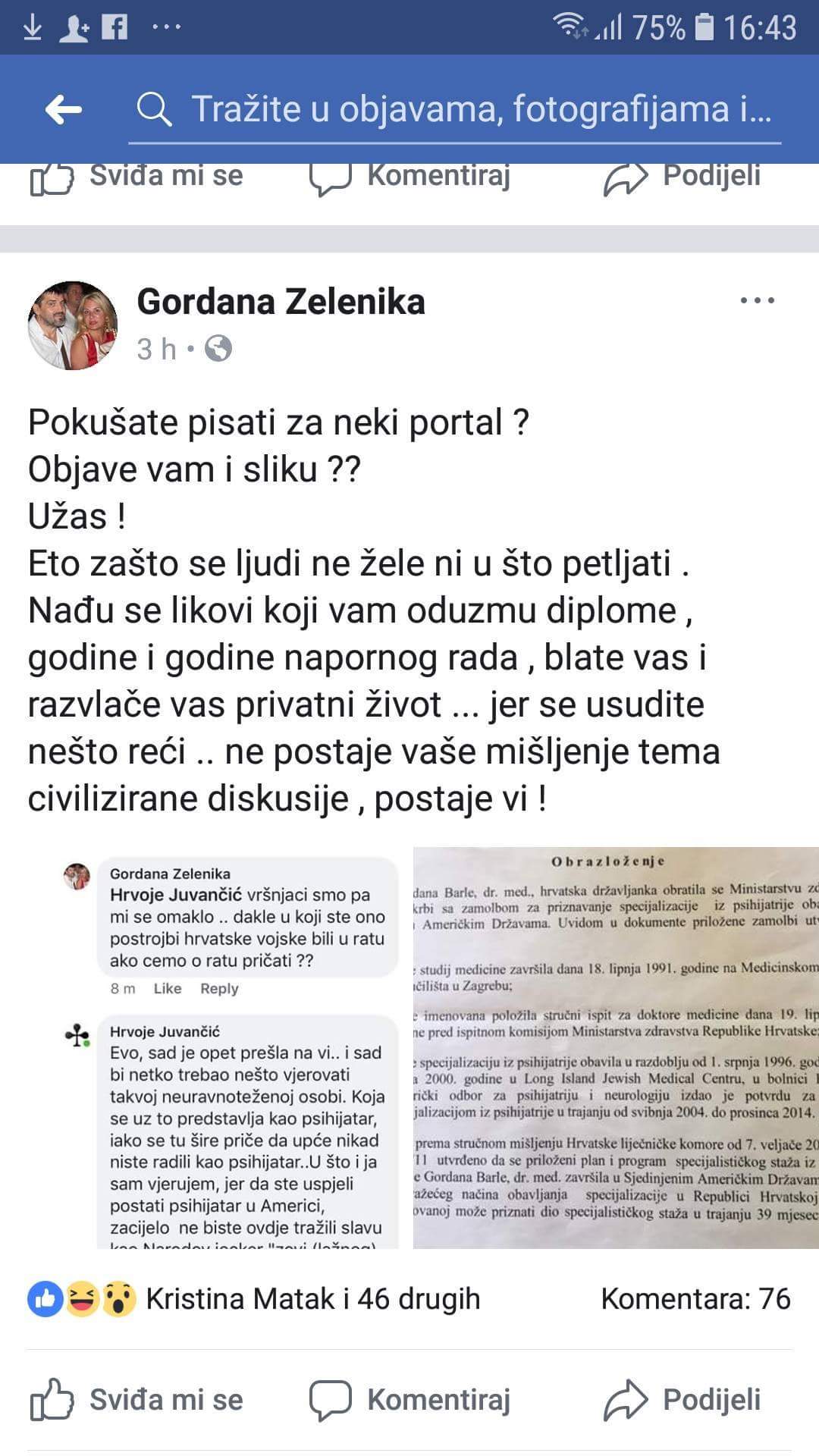 Njegov stav na društvenim mreža ocrnio je psihijatricu, koju je nazvao luđakinjom na svoj osebujan način i drzno se sumnjati u njenu diplomu. Gospođa je poznata po domoljubnim tekstovima i vrlo inteligentnim prosudbama, pa nije jasno zašto mu njeno domoljublje smeta.